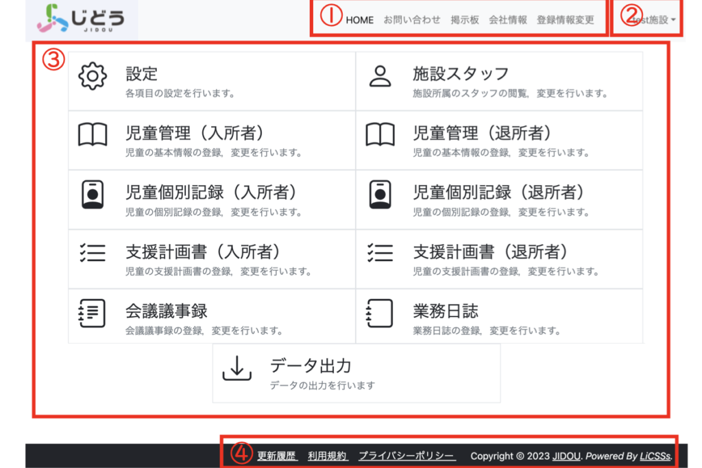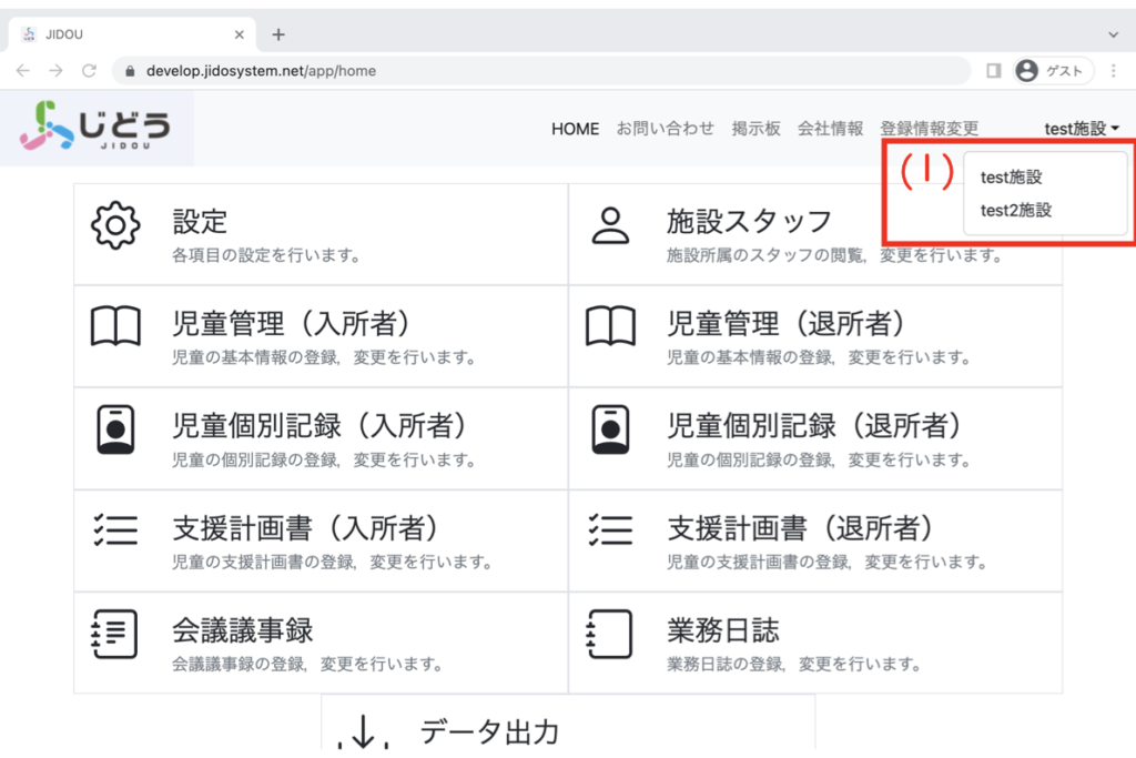 表示される情報や登録する情報は全て②の選択中施設と紐づけられます。