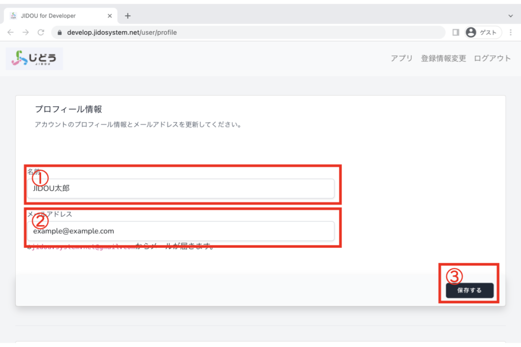 ①名前,②メールアドレスを入力したら保存ボタンをクリックしてください。